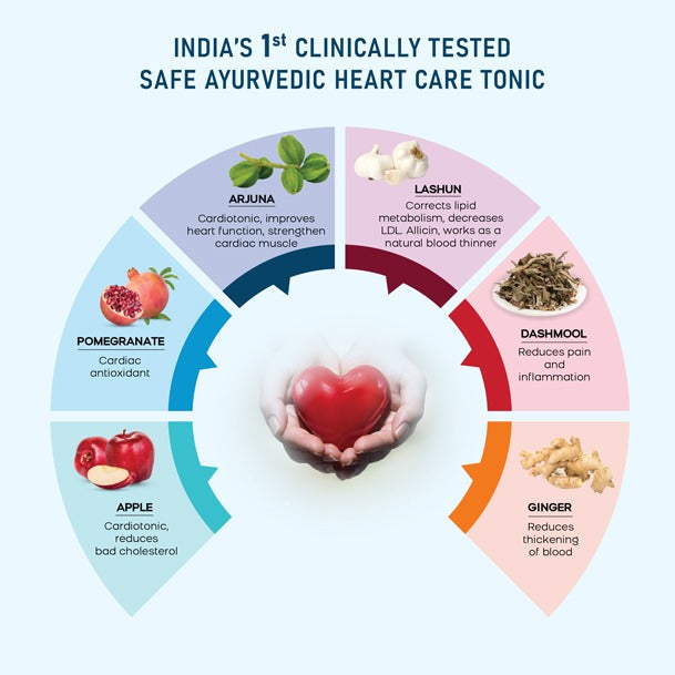 The syrup contains natural herbs such as Arjuna,Garlic, Apple, Pomegranate, Lemon, Dashmool, Ginger, and Honey known for their cardiovascular benefits.