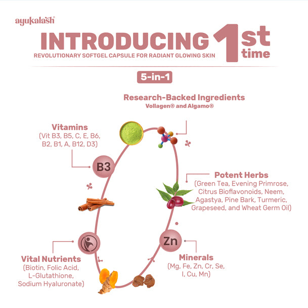 Our cutting-edge research has developed, for the first time, a 5-in-1 formulation that not only matches but often exceeds traditional benefits. Ayukalash's Skin-Radiant Glow combines clinically proven ingredients, herbs, vitamins, minerals, and essential nutrients for exceptional skin health and radiance.