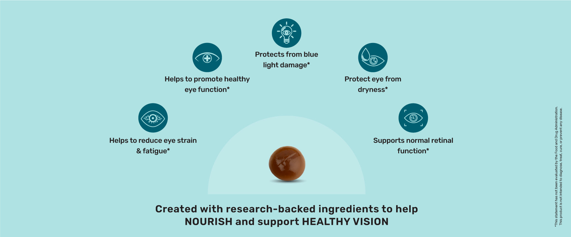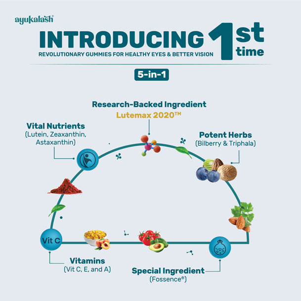 For the very first time, Ayukalash Healthy Vision Gummies bring you a unique 5-in-1 formulation designed to support overall eye health, protect against blue light, and reduce the effects of eye strain.